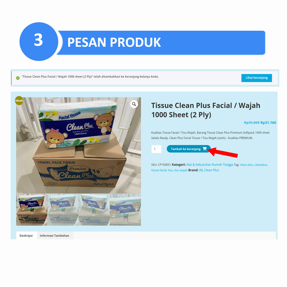 Tambahkan produk yang telah Anda temukan ke keranjang belanja dengan cara klik tombol TAMBAHKAN KE KERANJANG