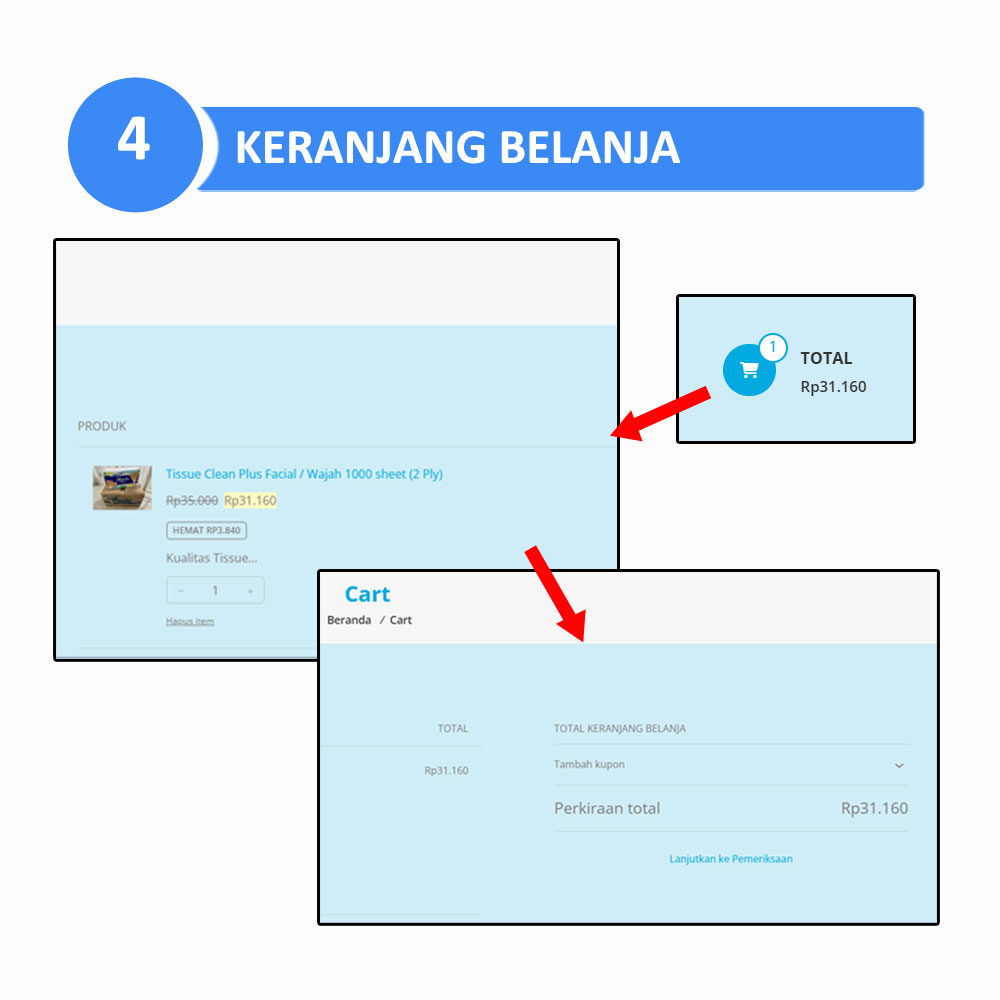 Cek keranjang belanja Anda dengan klik icon keranjang belanja dan klik tombol Lanjutkan Ke Pembayaran setelah memastikan daftar produk di keranjang belanja Anda,